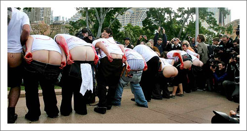 As iniciativas Traseiros para Bush (Kiss my ass George) e Belezas (Modelos) contra Bush deram o corpo ao manifesto em Sydney, Australia e pelo menos a primeira continua em acção.(fotografias retiradas do jumento)